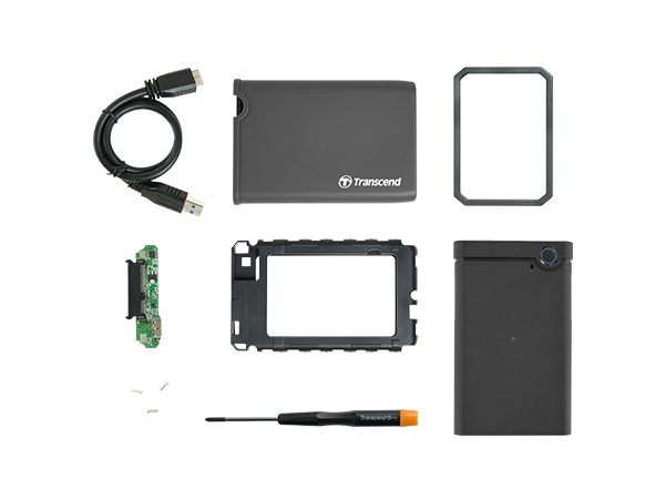 創見SSD/HDD升級套件組內附一個2.5吋外接盒、外層橡膠套、內層橡膠防震套、一個SATA轉板、一條USB連接線、一個7mm轉9.5mm的墊高片、一把PH1螺絲起子、以及三顆M2螺絲。