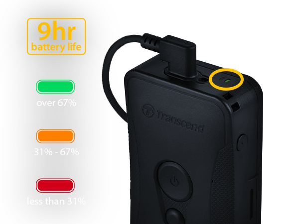 DrivePro Body 70內建大容量鋰電池,充飽電後可最長連續錄影9個小時,方便警察與保全安防人員完整記錄當班值勤的工作情況。